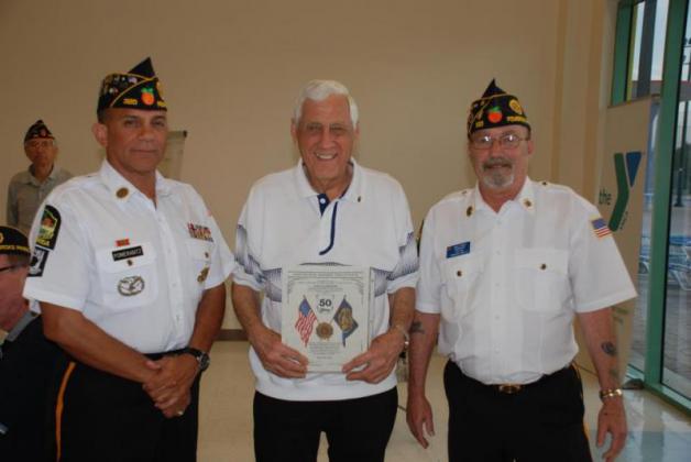 Bruckenthal-Cann Post 385 member Larry Lehtonen was presented with a 50-year pin, and certificates from National and Post 385 during our April meeting. Making the presentation were Commander James Tewes and member Teddy Pomerantz.