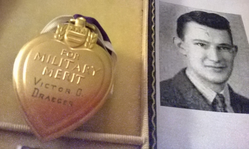 This Purple Heart has been on a long journey. It was found in the bottom of a box purchased at a flea market in Wisconsin. Surprised by this discovery and recognizing the significance, the new owner did some preliminary research on the name engraved on the back of the medal, Victor O. Draeger, and brought it to Jeff Johnson, the Wounded Warrior program coordinator at the VA hospital in Madison, Wis. Jeff in turn gave it to Yvonne Duesterhoeft, the county veterans service officer for the general area where records indicated that the Draeger family resided. Yvonne and her family continued the quest to learn more about him and hopefully find some living relatives. With the help of research librarians, Victor’s high school yearbook photo was located, but no living relatives could be found. It was learned that Victor, a 19-year-old farm boy from Fort Atkinson, Wis., was wounded at Mirecourt, France, on 13 September 1944 and died on 15 September 1944. He died during the liberation battles for the town of Mirecourt. He is buried at the American Battle Monuments Commission’s Epinal American Cemetery. His grave is located at Block A, Row 41, Grave 32. He had never married, had no children, and his mother had died a few years ago in a nursing home.